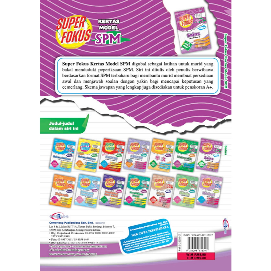 Super Fokus Kertas Model SPM digubal sebagai latihan untuk murid yang bakal menduduki peperiksaan SPM. Siri ini ditulis oleh penulis berwibawa berdasarkan format SPM terbaharu bagi membantu murid membuat persediaan awal dan menjawab soalan dengan yakin bagi mencapai keputusan yang cemerlang. Skema jawapan yang lengkap juga disediakan untuk penskoran A+.
