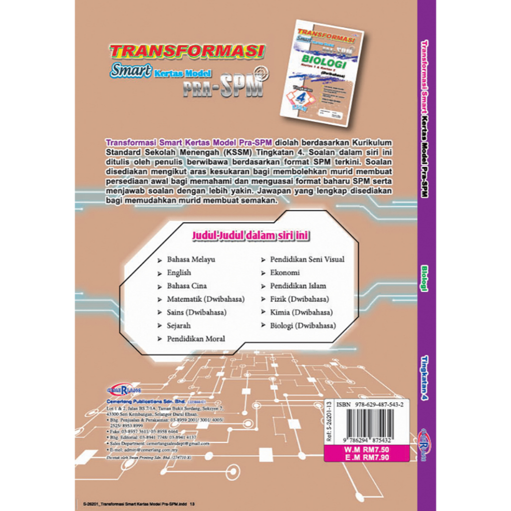 Transformasi Smart Kertas Model Pra-SPM diolah berdasarkan Kurikulum Standard Sekolah Menengah (KSSM) Tingkatan 4. Soalan dalam siri ini ditulis oleh penulis berwibawa berdasarkan format SPM terkini. Soalan disediakan mengikut aras kesukaran bagi membolehkan murid membuat persediaan awal bagi memahami dan menguasai format baharu SPM serta menjawab soalan dengan lebih yakin. Jawapan yang lengkap disediakan bagi memudahkan murid membuat semakan.