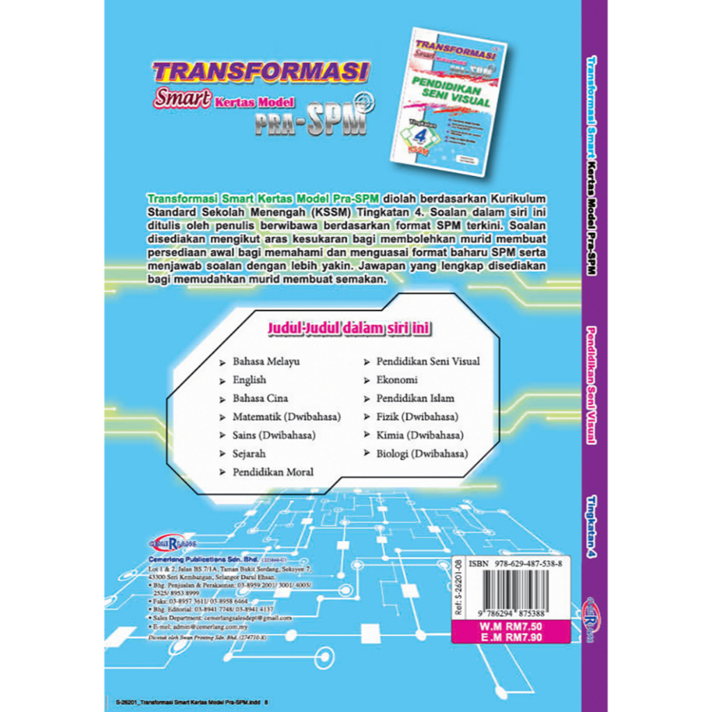 Transformasi Smart Kertas Model Pra-SPM diolah berdasarkan Kurikulum Standard Sekolah Menengah (KSSM) Tingkatan 4. Soalan dalam siri ini ditulis oleh penulis berwibawa berdasarkan format SPM terkini. Soalan disediakan mengikut aras kesukaran bagi membolehkan murid membuat persediaan awal bagi memahami dan menguasai format baharu SPM serta menjawab soalan dengan lebih yakin. Jawapan yang lengkap disediakan bagi memudahkan murid membuat semakan.